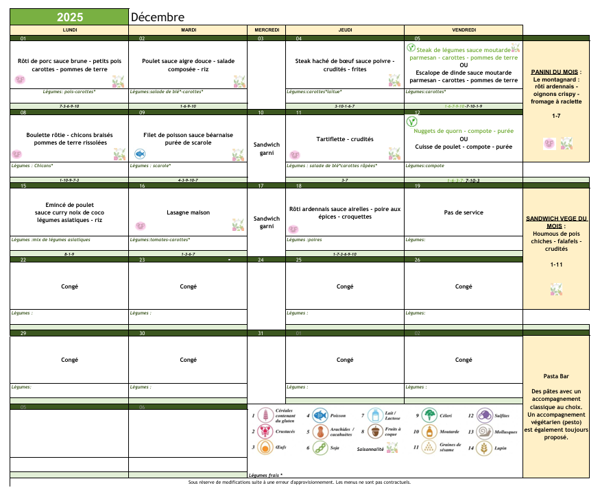Sous réserve de modification suite à une erreur d’approvisionnement Les menus ne sont pas contractuels