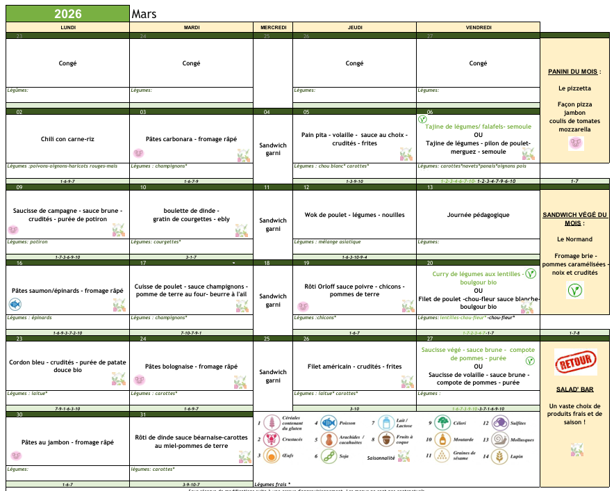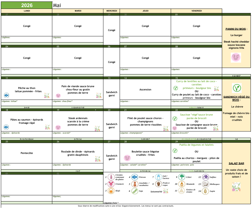 Sous réserve de modification suite à une erreur d’approvisionnement Les menus ne sont pas contractuels